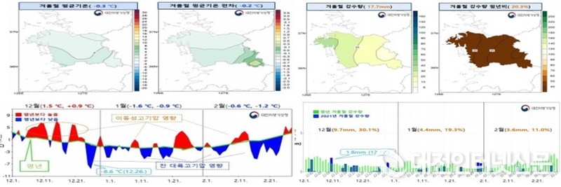 2021년 겨울철 대전·세종·충남 평균기온은 –0.3℃(평년대비 –0.2℃, 24위)로 평년과 비슷했다. 대륙고기압과 이동성고기압의 영향을 주기적으로 받아 평년보다 기온이 낮은 날과 높은 날이 짧은 주기로 반복적으로 나타났다. 12월 상~중순에는 이동성고기압의 영향을 주로 받아 따뜻한 날이 많았으나, 12월 하순에는 대륙고기압이 강하게 발달하고 대기 중층(약 5.5km 상공) 영하 30도의 찬 공기가 유입되어 지난 겨울 기간