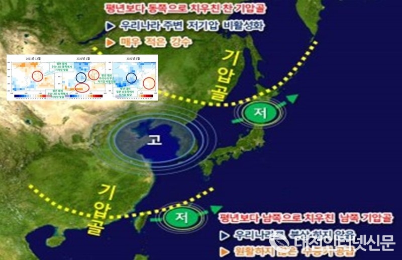 일반적으로 겨울철 저기압이 중국이나 서해상에서 생성되어 우리나라를 통과하면서 수증기를 공급하고 비를 뿌리지만, 이번 겨울철은 우리나라 주변을 지나는 저기압이 대기 상층 기압골의 지원을 받지 못하면서 비나 눈의 양이 많지 않았다.