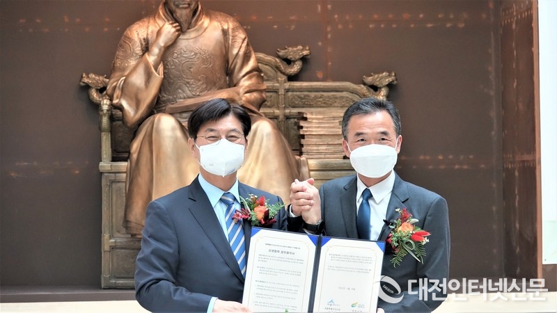 이춘희 세종시장(왼쪽)과 이항진 여주시장(오른족)이 협약 체결 후 협약서를 들고 기념 촬영하고 있다. [사진-대전인터넷신문]