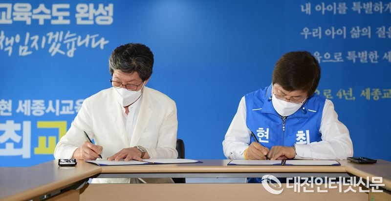 협약서에 서명하는 최교진 후보와 유근준 회장[사진-최교진 세종시교육감 후보 캠프]