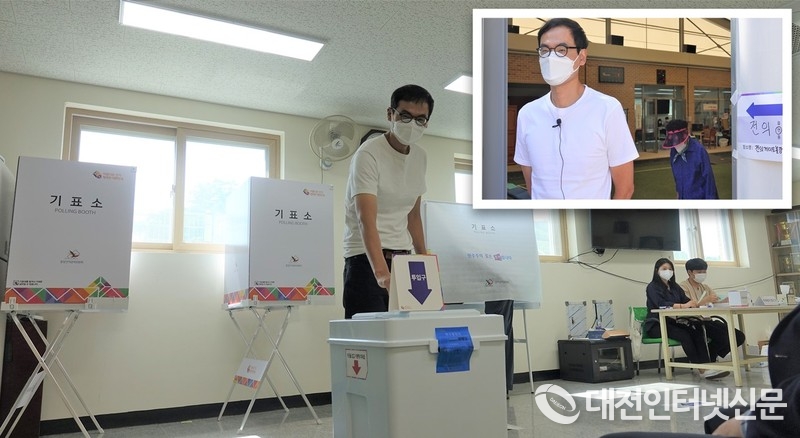 전의면 게이트볼장에 마련된 투표소에서 투표하는 김성철 씨 [사진-대전인터넷신문]
