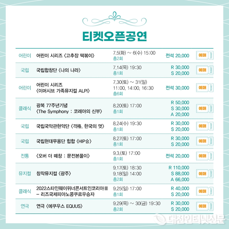 [대전인터넷신문=세종/권혁선 기자] 세종시문화재단이 오는 13일 오후 14시에 세종 예술의전당 2022 여름·가을 시즌(7월~9월) 총 10개 기획공연의 티켓을 오픈한다고 밝혔다.