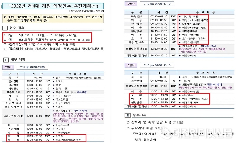 세종시의회 사무처가 여야의원들에게 배포한 의정 연수 일정표에 따르면 의정활동 첫날(7월 11일) 오전 9시 20분 의회집결 등록 후 의회 버스를 이용 조치원 문화 정원으로 이동, 기념촬영과 오찬, 휴식, 특강(3시간), 오후 5시부터 신도시 내 베스트웨스턴 세종으로 이동, 만찬과 숙박을 하고 2일 차 오전 9시 30분부터 세종시 홍보관, 대통령기록관, 오찬, 의정특강(2시간 30분), 의회 복귀 및 해산, 3일 차 특강, 오찬, 베어트리파크 현장 방문 후 복귀 및 해산하는 것으로 짜여 있었다.