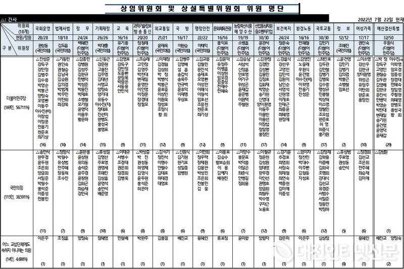 이밖에 대전 출신 박범계 전 법무부 장관은 법제사법 위원회 위원으로, 황운하 의원은 정무위로, 조승래 의원은 과학기술정보 방송통신위로, 박병석 전 의장은 외교통일위로, 박영순 의원은 산업통상자원 중소벤처기업위로 상임위 배정이 완료되면서 전체 더불어민주당 의원 169인(56.711%)과 국민의힘 전체 115인(38.591%)의 상임위 배정이 완료됐다.