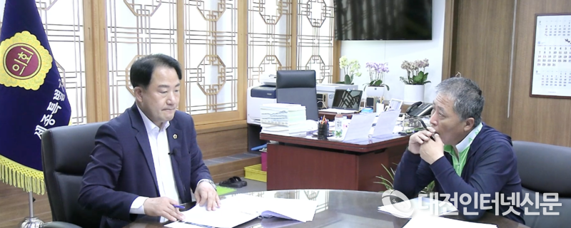 최대열 대전인터넷신문 본부장(우)과 인터뷰를 진행하는 상병헌 세종시의회 의장(좌)의 모습. [사진-대전인터넷신문]