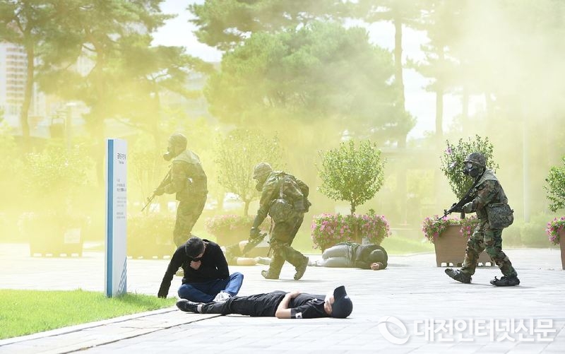 이날 훈련에는 시뿐만 아니라 32사단 화생방지원대, 세종시 경비단, 세종남부경찰서 및 경찰특공대, 세종소방서 등 유관기관에서 약 100여 명이 참가했다