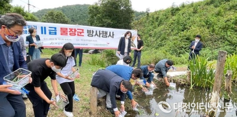 금강유역환경청이 지난 9월 13일 충남 아산시 송악면 동화리 584번지 소재 ‘백학동 반딧불이 서식지’에 멸종위기 야생생물 Ⅱ급인 물장군 70개체를 방사했다.[사진-금강유역환경청]