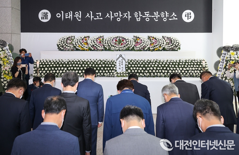 [대전인터넷신문=대전/백승원 기자] 이장우 대전시장은 31일 간부공우원들과 함께 대전시청 1층에 설치된 이태원 사고 사망자 합동분향소를 찾아 조문했다.