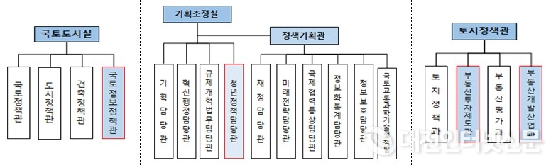 아울러, 정책환경 변화에 대응하여 국토정보정책관과 청년정책과의 소관을 각각 국토도시실과 기획조정실로 변경하고, 주택토지실 토지정책관을 개편한다.