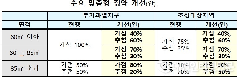 현재 규제지역 내 중소형 주택(85㎡ 이하)은 가점제 비율이 높아(투기과열지구 100%, 조정대상지역 75%), 부양가족이 적고 무주택기간이 짧은 청년 가구의 내 집 마련 기회가 부족하였다.이에, 청년 가구의 수요가 높은 주택에 대하여는 추첨제 비율을 상향 조정하고, 중장년 가구 수요가 많은 대형주택(85㎡ 초과)의 경우는 가점제를 확대하여 수요자의 요구에 맞도록 개편할 계획이다.