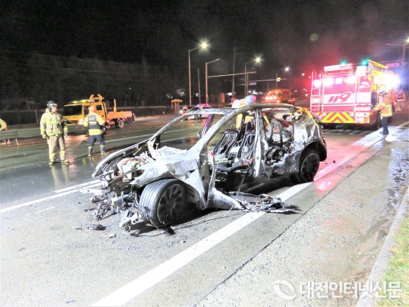 [대전인터넷신문=세종/최대열기자] 9일 밤 10시 28분경 세종시 소정면 운당리 1번 국도길(세종 방향)에서 테슬라 전기 차량이 가드레일 추돌 후 배터리 발화로 추정되는 화재가 발생 차량이 전소됐다.