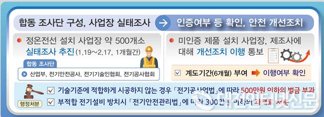 금번 실태조사는 산업부, 전기안전공사, 전기기술인협회, 전기공사협회 등과 합동 조사단을 구성하여, 현재 정온전선을 설치하여 사용 중인 사업장 약 500여 개소를 대상으로 사용실태 등을 점검할 예정이며, 전기설비기술기준 등 관련 규정에 따른 정온전선의 인증 취득 또는 제품시험 여부 확인, 무자격자에 의한 불법 시공여부 등을 중점 조사할 계획이다. 또한, 정온전선 시공(보온재, 벽체 내 설치 등) 특성상 외부인이 쉽게 확인하기 어려운 점을 고려하여, 각 사업장에 선임되어 있는 전기안전관리자와 협조체계를 구축하여 실태조사 수행의 효율성·실효성을 높일 방침이다.