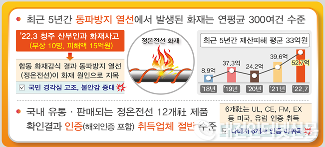 지난 `22.3월 청주 산부인과에서 발생 된 화재 사고(부상 10명, 피해액 20억 원)의 주요 원인이 1층 주자창(천장)에 설치된 정온전선으로 밝혀짐에 따라, 화재우려에 대한 경각심이 더욱 고조됨에 따라 산업부는 국내에서 유통·판매되는 정온전선 12개社의 제품을 수거하여 확인한 결과, 인증(해외인증)을 취득한 업체는 절반(50%, 6개社) 수준에 불과한 것으로 파악되었다.