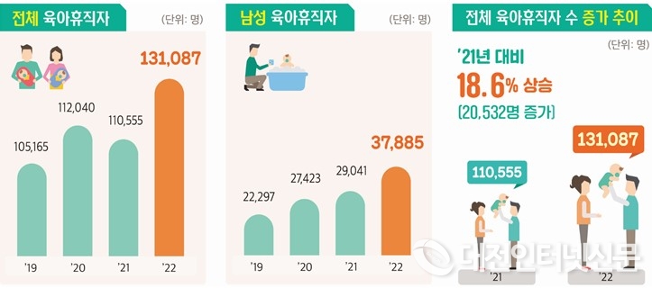 22년 육아휴직자 131,087명으로 전년 대비 18.6% 증가... 육아기 근로시간 단축 사용자 19,466명으로 전년 대비 16.6% 증가