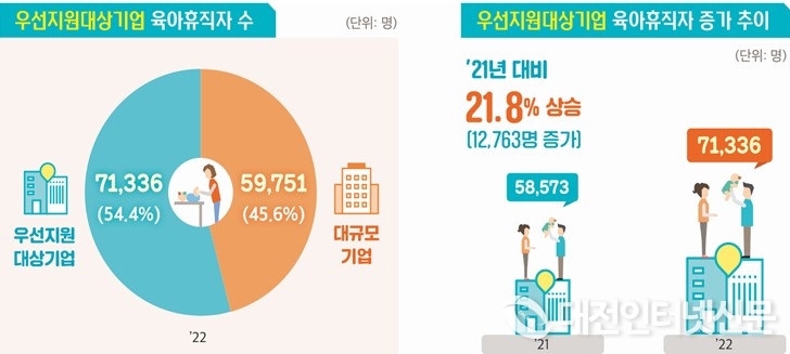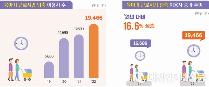 [대전인터넷신문=세종/최대열기자] 고용노동부에 따르면 2022년 육아휴직·육아기 근로시간 단축 사용자가 전년 대비 16.6%, 2,777명이 증가(공무원, 교사 등 고용보험 미가입자는 미포함)한 것으로 나타났다.