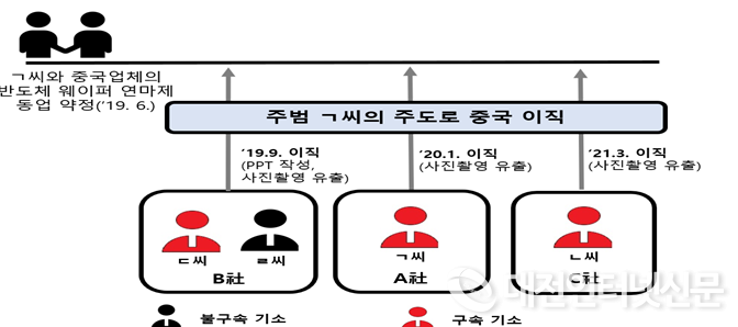 A社 前 직원이던 주범 ㄱ씨(55세, 구속)는, 임원 승진에 탈락하자 2019년 6월 중국업체와 반도체 웨이퍼 연마제(CMP 슬러리) 제조사업 동업을 약정하고, A社에 계속 근무하면서도 메신저 등으로 중국 내 연마제 생산설비 구축 및 사업을 관리하기 시작하면서 B·C社 연구원인 ㄴ씨(52세, 구속), ㄷ씨(42세, 구속), ㄹ씨(35세, 불구속)를 스카우트해 중국으로 이직시켰으며, 2020년 5월부터 ㄱ씨 자신도 중국 업체의 사장급으로 이직해 근무했다. A·B·C社는 모두 코스피 또는 코스닥시장 상장사들로서, 시가총액 합계 66조원 상당인 이 분야 독보적인 기업들이다.