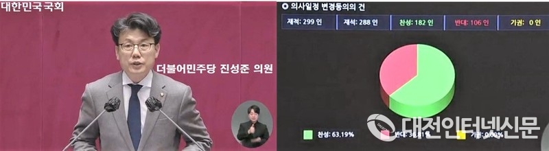 이어서 진행된 탄핵소추안을 먼저 심의하자며 제안설명에 나선 더불어민주당 진성준(서울 강서을) 의원은 “의사 일정 변경 동의안은 그동안 본회의에서 4차례 탄핵소추안을 처리하면서도 다른 안건에 우선하여 처리해 왔다”라며 의사 일정 제2항 행정안전부 장관 이상민 탄핵소추의 건을 제1항 교육 사회 문화에 관한 대정부 질문에 앞서 상정하여 심의 처리해 주는 것에 찬성해 줄 것을 제안했고 김진표 국회의장이 국회법 제77조에 따라 토론 없이 표결에 부쳐 제적 299명, 제석 289명, 찬성 182명, 반대 106명으로 의사 일정 변경 동의안건은 가결됐다.