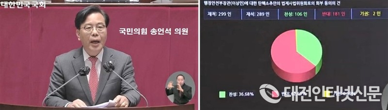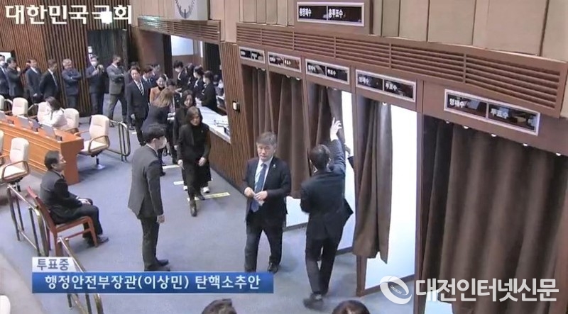 [대전인터넷신문=세종/최대열기자] 지난 2월 6일 발의된 이상민 행안부 장관 탄핵소추안이 8일 개회된 제403회 국회(정기회) 제4차 본회의에서 출석 의원 293명 중 179명 찬성으로 국회 본회의를 통과했다.