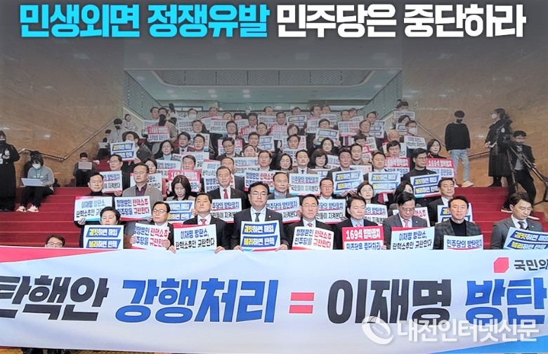 정진석 비상대책위원장은“국민들이 눈을 부릅뜨고 지금 이 상황을 지켜보고 있다. 거대의석을 앞세워서 지금까지 제1야당 민주당이 보여준 것이 무엇인가. 들이 민생을 걱정했는가. 국가의 전체적인 방향설정에 대해서 동의를 했는가. 제1야당이라는 거대의석만을 앞세워서 그들이 한 것은 윤석열 정부에 대한 대선 결과에 대한 사실상 불복하고, 발목잡기를 넘어서 발목 꺾기를 자행하고 있고, 도저히 이것은 묵과할 수 없는 헌정사에 씻을 수 없는 오점을 남기고 있는 작태라는 것을 지적하지 않을 수 없다”라며 “오역의 기록을 국민들에게 고발하면서 지금의 이 반헌법적인 의회주의 폭거와 작태는 반드시 국민들에 의해서 심판받을 것이라는 점을 분명히 지적한다”라고 밝혔다.