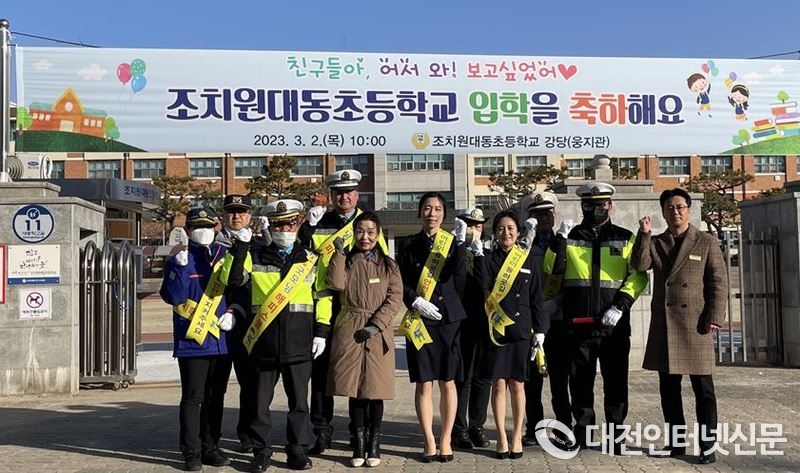 세종북부경찰서가 신학기를 맞아 조치원 대동초등학겨에서 어린이 교통안전 캠페인을 펼쳤다.[사진-세종북부경찰서]