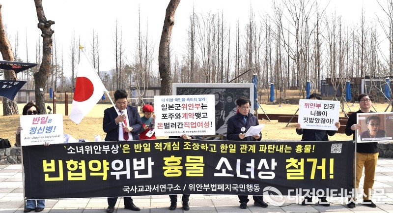 단체는 '반일은 정신병' 등 구호를 적은 피켓을 들고 소녀상 철거를 촉구했다. [사진-대전인터넷신문]