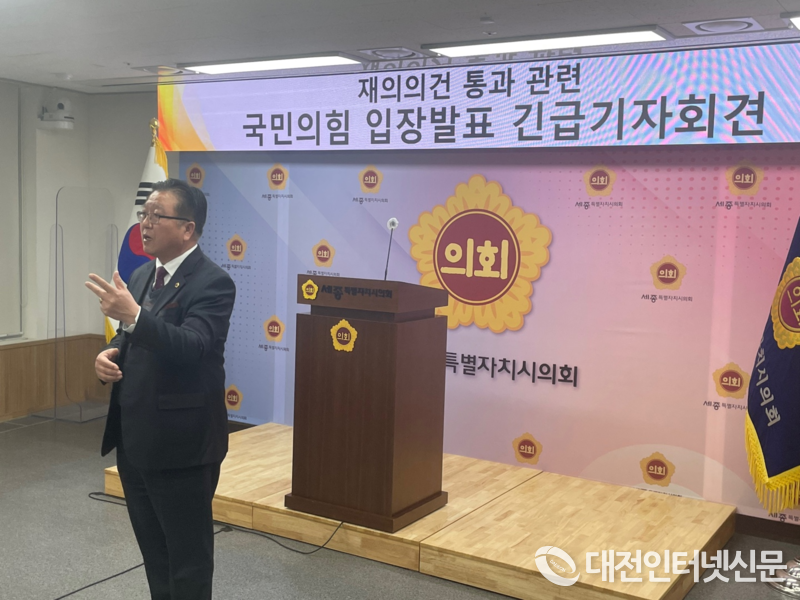 이날 재의의건 통과와 관련해 긴급 기자회견에 참석해 발언하는 김학서 의원의 모습. [사진-대전인터넷신문]