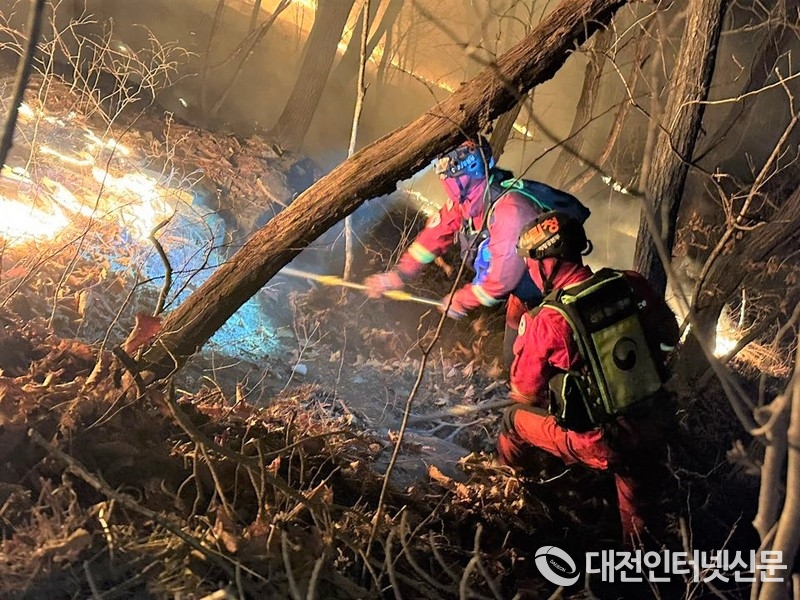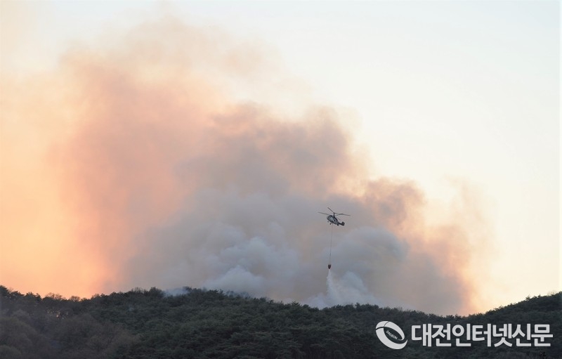 대전 서구는 일출과 동시에 산불진화헬기 15대(산림청 9, 지자체 1, 군 4, 소방 1)를 투입하여 주불 진화할 계획이다.