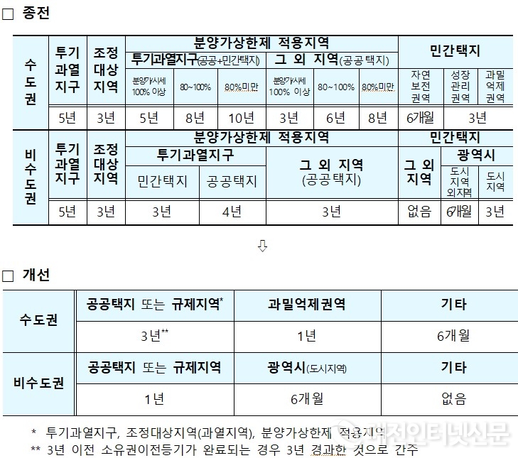 수도권은 공공택지・규제지역은 3년, 과밀억제권역은 1년, 그 외 지역은 6개월로 완화하고, 비수도권은 공공택지・규제지역은 1년, 광역시 도시지역은 6개월로 완화하고, 그 외 지역은 전면 폐지한다.