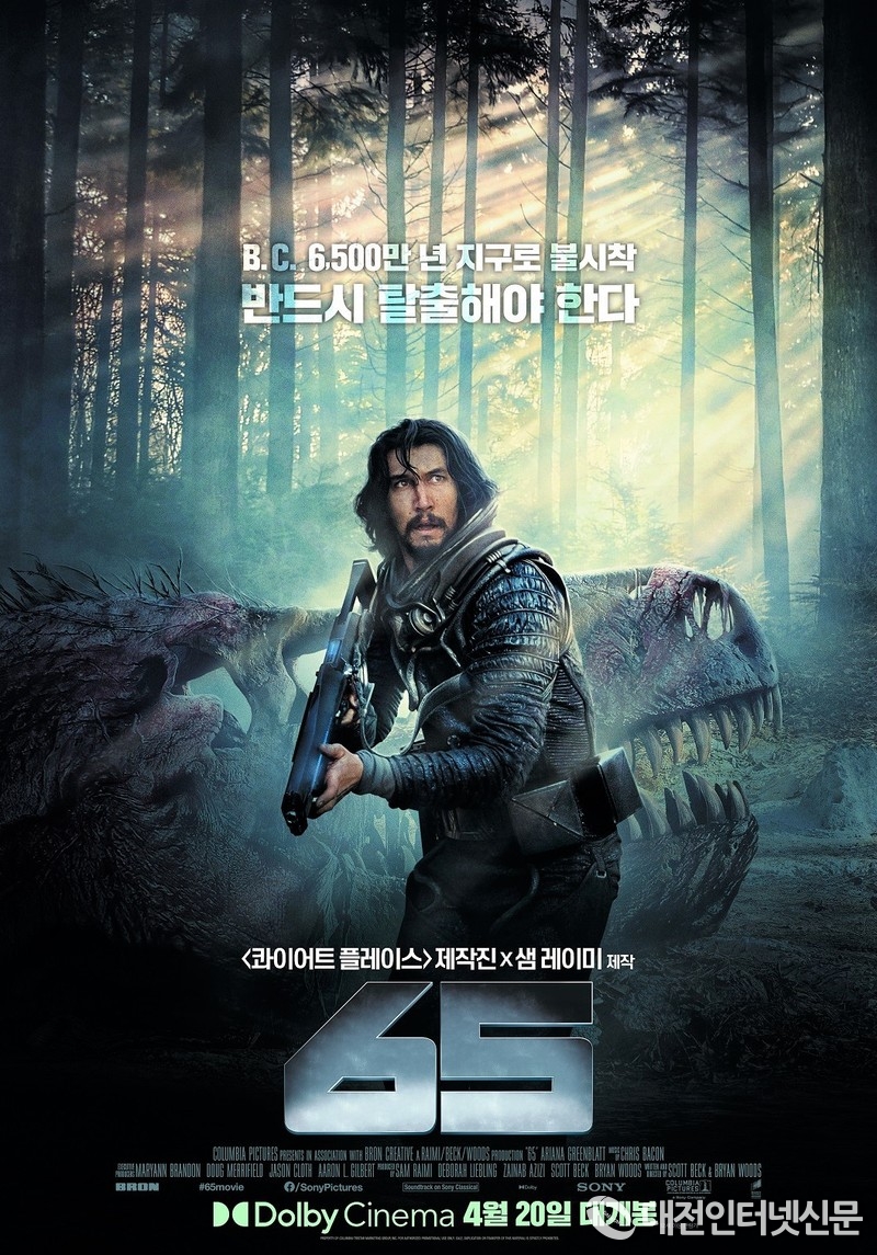 20일에는 서바이벌 액션 <65>가 국내 관객들을 찾아온다. 6,500만 년 전 지구에 불시착하게 된 우주비행사 ‘아담’과 탑승자 ‘코아’가 공룡에 맞서 펼치는 치열한 사투를 담은 작품으로, ‘공포물의 대가’ 샘 레이미와 '콰이어트 플레이스' 시리즈로 이름을 알린 스콧 백, 브라이언 우즈가 제작 및 연출을 맡아 개봉 전부터 많은 기대를 모으고 있다. 특수효과로 구현된 공룡의 위협적인 비주얼과 움직임은 디테일한 피부 질감까지 실감 나게 표현하는 돌비 비전 기술과 만나 스크린을 뚫고 나오는 듯한 극강의 리얼리티를 선사한다. 이와 함께 공간을 가득 메우는 돌비 애트모스 사운드가 치열한 전투씬의 긴장감을 배가시키며 강렬한 서스펜스의 세계로 관객들을 안내한다.
