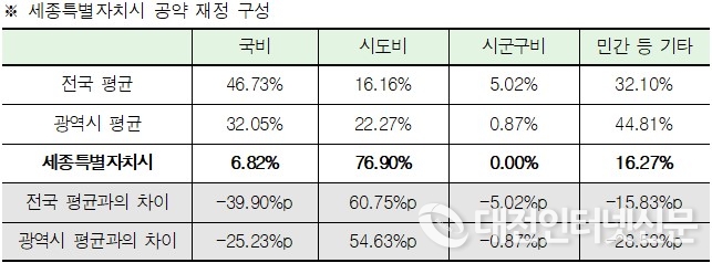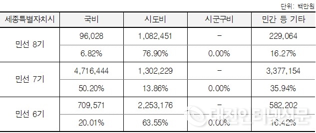 세종특별자치시 재정 구성은 국비 96,028백만원(6.82%), 시도비 1,082,451백만원(76.90%), 민간 등 기타 229,064백만원(16.27%)인 것으로 확인됐다.
