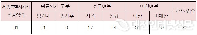 세종특별자치시의 공약실천계획을 살펴보면, 총 공약수는 61개이고 이 중 임기내 종료되는 공약은 100.00%(61개)인 것으로 나타났다. 기추진 사업은 27.87%(17개)였으며 신규 사업은 72.13%(44개)로 확인되었다. 예산이 필요한 사업은 83.61%(51개)였으며 국책사업은 25개로 나타났다.111