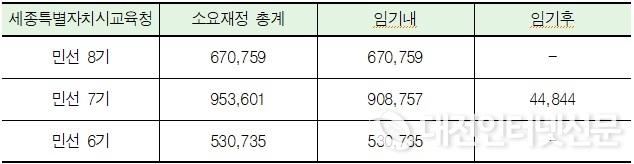 세종특별자치시교육청 공약 재정 계획은 총 670,759백만원으로 지난 민선 7기 공약 재정 계획 총계 953,601백만원보다 -282,842백만원 더 작은 규모이다. 임기내 670,759백만원이 모두 투입될 예정이다.
