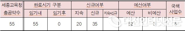 세종특별자치시교육청의 공약실천계획을 살펴보면, 총 공약수는 55개이며, 임기내 종료되는 공약은 100.00%(55개)인 것으로 나타났다. 기추진 사업은 36.36%(20개)였으며 신규 사업은 63.64%(35개)로 확인되었다. 예산이 필요한 사업은 94.55%(52개)였으며, 국책사업은 6개로 나타났다.