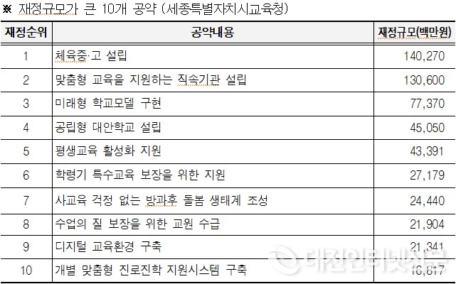 세종특별자치시교육청 공약 중에 재정이 가장 크게 소요되는 사업은 ①체육중·고 설립(140,270백만원), ②맞춤형 교육을 지원하는 직속기관 설립(130,600백만원), ③미래형 학교모델 구현(77,370백만원), ④공립형 대안학교 설립(45,050백만원), ⑤평생교육 활성화 지원(43,391백만원), ⑥학령기 특수교육 보장을 위한 지원 (27,179백만원), ⑦사교육 걱정 없는 방과후 돌봄 생태계 조성(24,440백만원), ⑧수업의 질 보장을 위한 교원 수급(21,904백만원), ⑨디지털 교육환경 구축(21,341백만원), ⑩개별 맞춤형 진로진학 지원시스템 구축(16,817백만원)인 것으로 확인됐다.