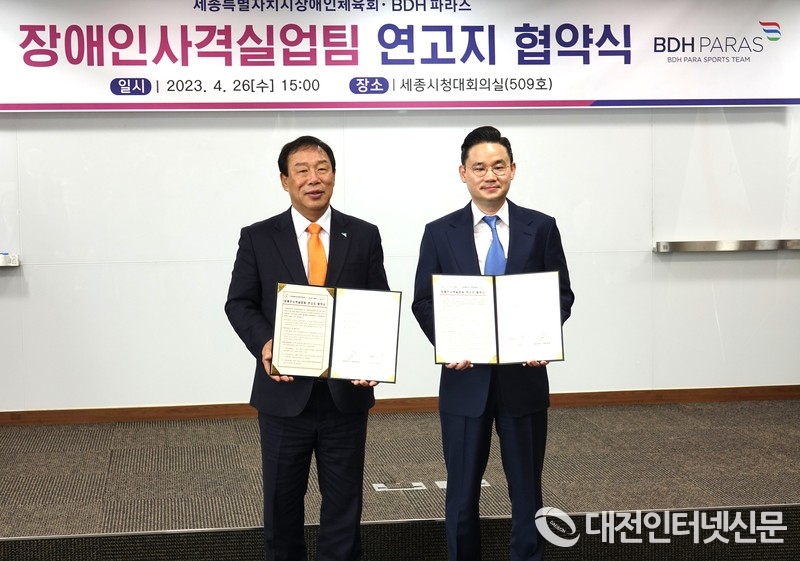 [대전인터넷신문=세종/백승원 기자] 세종특별자치시장애인체육회가 26일 시청 대회의실에서 비디에이치(BDH) 파라스와 '장애인사격실업팀 연고지 협약'을 체결했다.