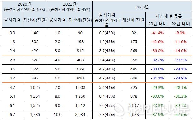 2023년 1주택자 공정시장가액비율을 43~45%로 설정함에 따라 납세자 세부담(’22년 공시가격 1~10억 기준)은 2020년 대비 29.3%~42.6% 감소할 것으로 예상되며, 2022년 대비 8.9~47% 감소할 것으로 예상된다.