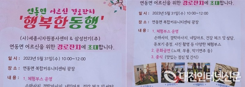 [대전인터넷신문=세종/최대열기자] 세종시자원봉사센터가 주관하고 삼성전기가 후원하는 연동면 어르신 경로잔치 ‘행복한 동행’이 31일 연동면복컴에서 어르신 및 관계자 500여 명이 참석한 가운데 성황리에 개최됐다.
