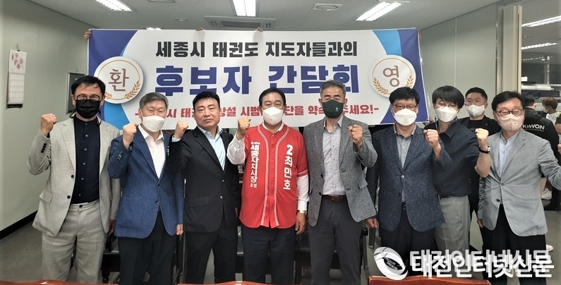 2022년 5월 당시 국민의힘 세종시장 후보로 나선 최민호 후보와 태권도협회가 정책간담회 후 기념촬영하는 모습. [사진-대전인터넷신문DB]
