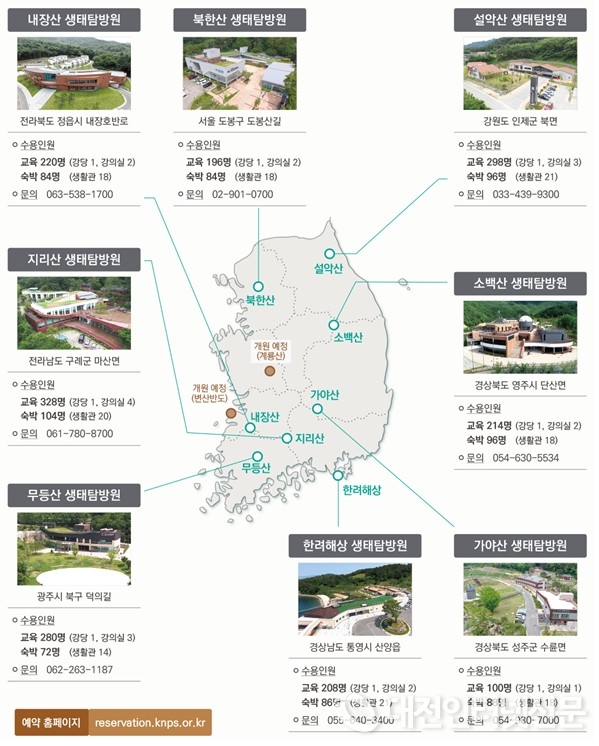 북한산생태탐방원(일상에서 만나는 자연 친구, 곤충)은 8월 7일부터 8일까지 25~30을 모집하고 ▲지리산생태탐방원(쿨(cool)한 지리산 여름캠프)은 8월 1일부터 2일, 8월 22일부터 23일까지 차수별 최대 25명까지, ▲설악산생태탐방원(설악산 사색비경 즐기기 여름편)은 7월 22일부터 23일까지 최대 30명을, ▲소백산생태탐방원(우리함께 숲愛 가자!)은 8월 18일부터 19일까지 최대 25명을, ▲한려해상생태탐방원(만지도알로의 깃털색을 찾아줘, 한산도 학의 날개를 펼쳐라)은 인원 제한 없이 상시운영을, ▲가야산생태탐방원(곤충탐험, 어린이 파브르)은 8월 4일부터 5일까지, 8월 11일부터 12일까지, 차수별 최대 30명을, ▲무등산생태탐방원(초록빛 여름캠프)은 7월 30일부터 31일까지 최대 35명을, ▲내장산생태탐방원(‘숲’며드는 여름여행)은 8월 6일부터 7일까지 최대 35명을 대상으로 프로그램을 운영할 예정이다.