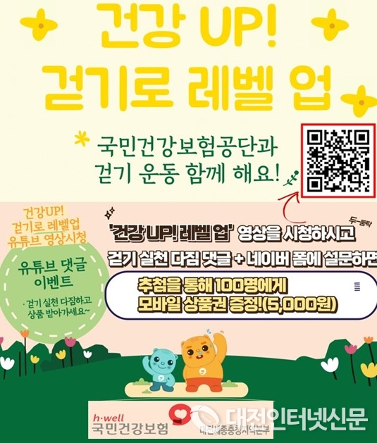 국민건강보험공단 대전·세종·충청지역본부(본부장 정일만)는 지역민의 건강증진 강화를 위해 ‘건강UP! 걷기로 레벨 업’ 걷기 동영상을 제작해 지역본부 유튜브에 게시하고 이벤트를 진행한다고 밝혔다.