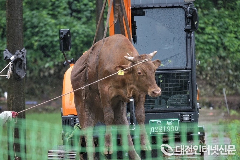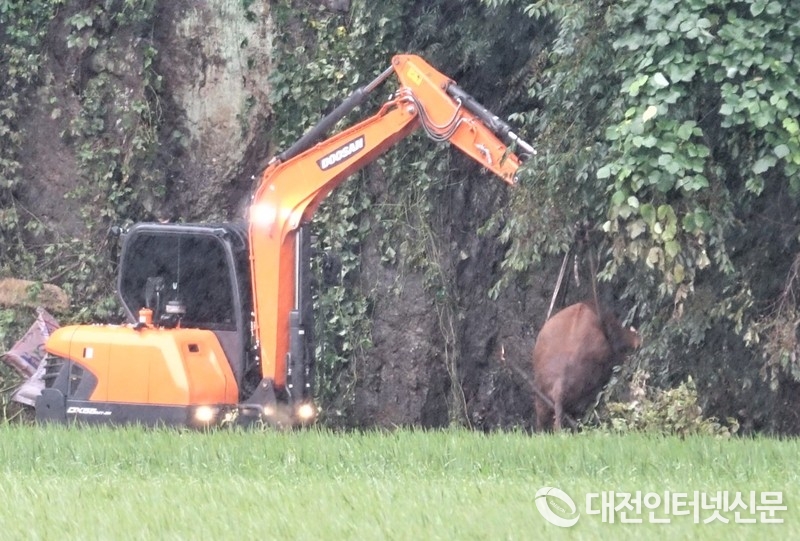 강가에서 구조된 소가 밧줄에 묶여 이동되는 모습. [사진-대전인터넷신문]