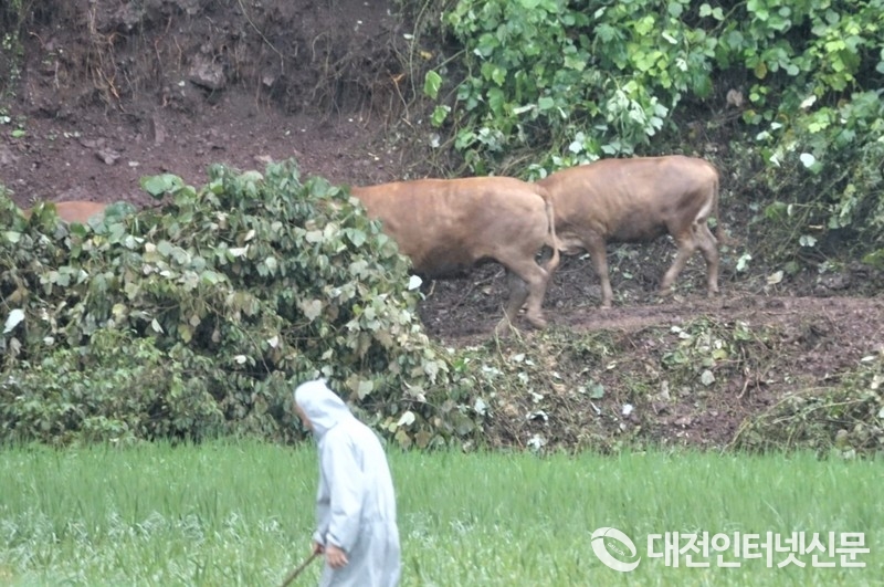 당초 예상과 달리 약한 비가 내리는 18일 공주시 이인면 만수로 일대는 하천이 범람하면서 논과 축사 등이 물에 잠기는 등 피해가 극심한 상황에서 산으로 대피한 소 떼를 찾으려는 일손과 발길이 분주했다.