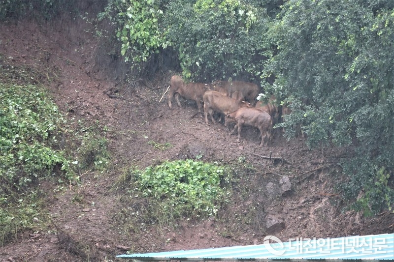 강 건너 산으로 대피한 소떼가 아슬아슬한 산기슭에서... [사진-대전인터넷신문]