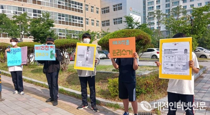 (왼쪽) 새롬중 학생들이 피켓을 들고 홍보 활동을 하고 있다.[사진-세종시교육청]