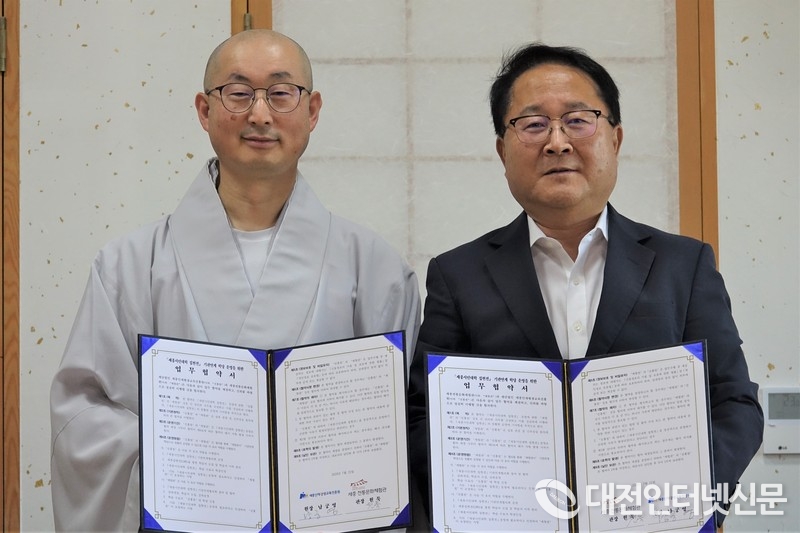 원묵 관장스님과 남궁영 세종인재평생교육진흥원장이 협약서에 서명하고 있다. [사진-대전인터넷신문]