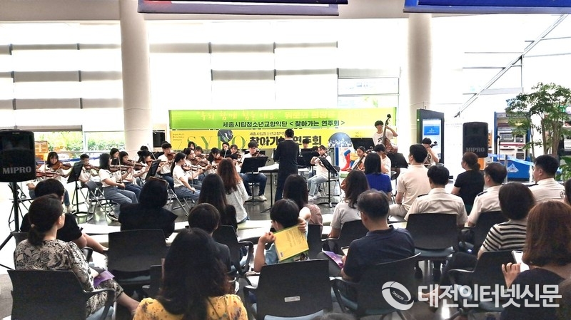 [대전인터넷신문=세종/최대열 기자] 세종시립 청소년교향악단이 26일 점심시간 대를 이용한 ‘찾아가는 연주회’를 시청 로비에서 개최했다.