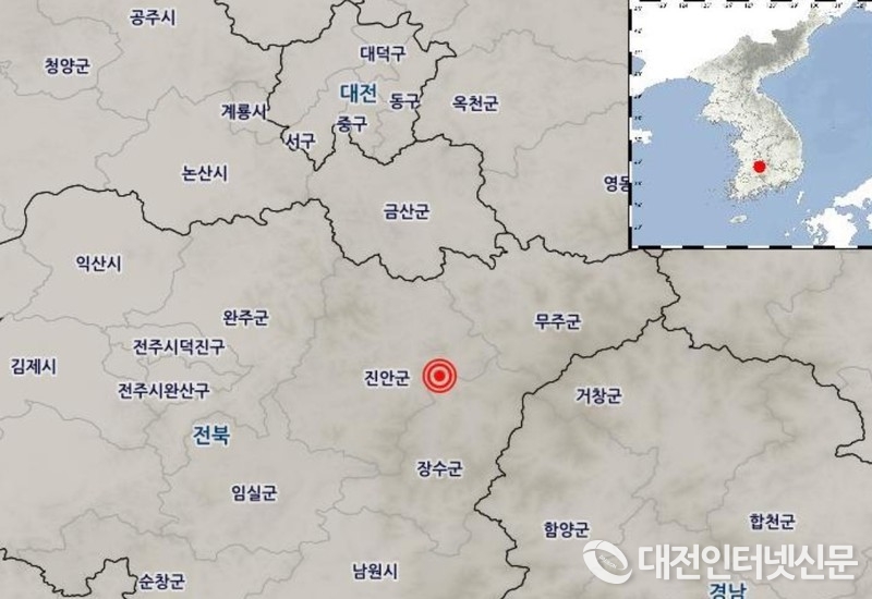 [대전인터넷신문=세종/최대열기자] 7월 29일 19시 07분 59초, 전북 장수군 북쪽 17km 지역, 6km 깊이에서 진도 3.5규모의 지진이 발생, 대전과 세종에서도 1~2규모의 지진동이 발생했다.