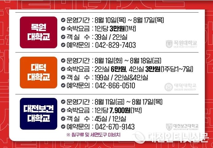 [대전인터넷신문=대전/이향순 기자] 대전시는 오는 8월 11일부터 열리는 ‘대전 0시 축제’ 방문객 편의를 위해, 3개 대학교 기숙사 283객실을 여행 숙소로 개방한다.