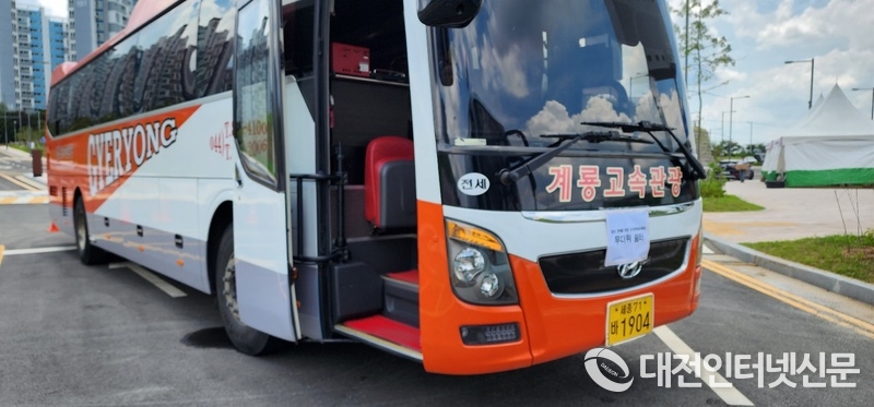 복숭아축제장 곳곳에 배치된 무더위 쉼터 버스. [사진-대전인터넷신문]