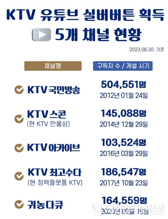 KTV 유튜브 실버버튼 획득 5개 채널 현황 표.[출처- KTV 국민방송]